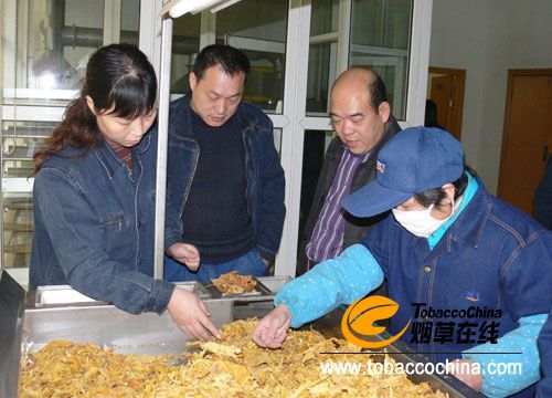 考評人員檢查煙葉質(zhì)量