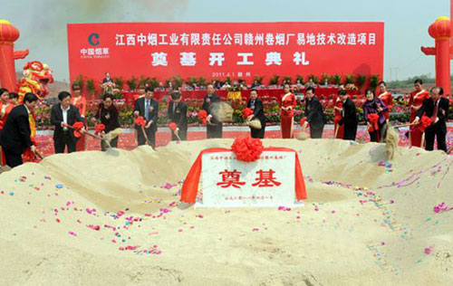 國家煙草專賣局局長姜成康、副局長李克明、總會計(jì)師張玉霞,副省長洪禮和,副省長、市委書記史文清,省工信委主任謝碧聯(lián),市委副書記、市長王平出席奠基儀式。省政府副秘書長胡世忠主持奠基儀式。江西中煙工業(yè)有限責(zé)任公司總經(jīng)理鄭偉介紹項(xiàng)目情況。市領(lǐng)導(dǎo)萬明、劉琮等出席奠基儀式。