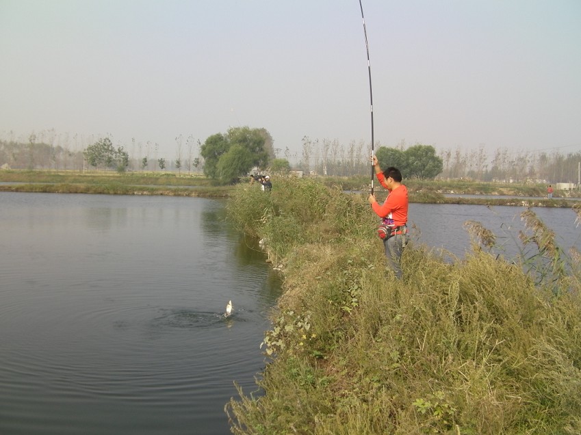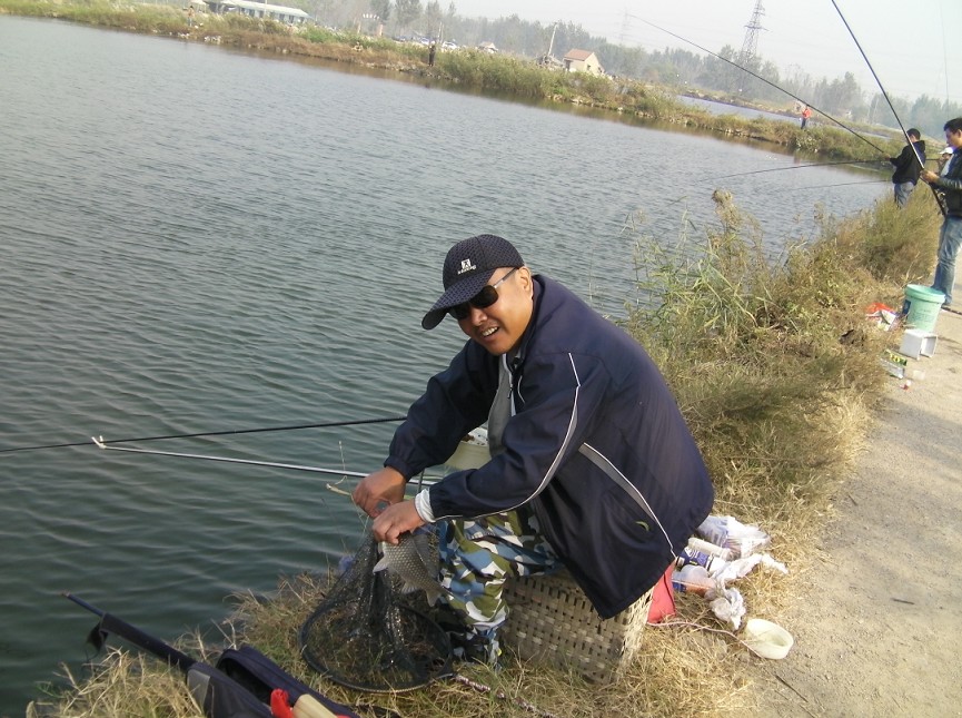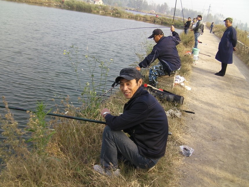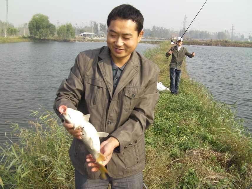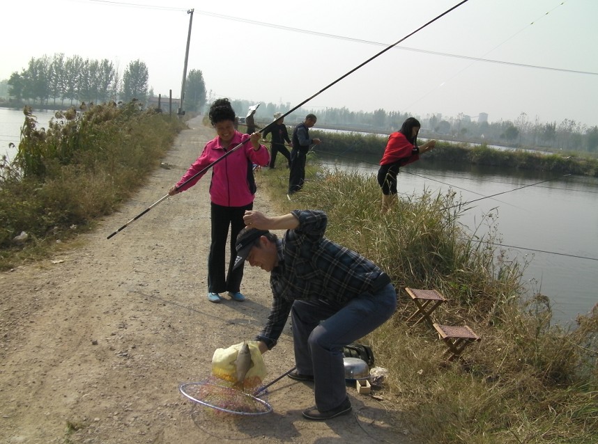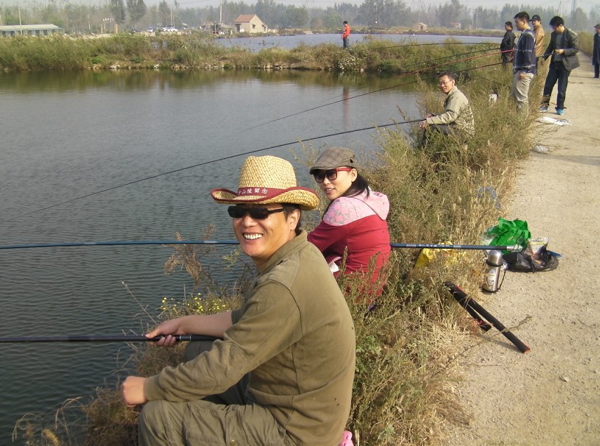 半小時后到達(dá)目的地。大家迫不急待拿出魚具,數(shù)十條魚竿分列池塘周圍,場面煞是壯觀。大家全神貫注,忙得不亦樂乎。投食,拌餌上食,串食,等浮漂,提竿,抄魚……上鉤魚兒 “噼啪”的拍水聲和大家的歡呼聲此起彼伏,映襯著一池碧水別有情趣。