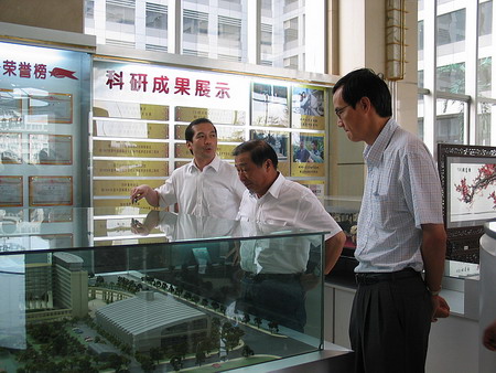 (閆亞明院長(zhǎng)向客人介紹我院科技成果展覽)