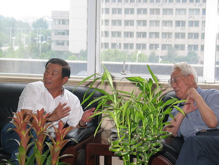 參觀完院區(qū),周昌貢總經(jīng)理一行看望了朱尊權(quán)院士和袁行思老院長(zhǎng)。一見(jiàn)到來(lái)自湖南的客人,朱老就關(guān)切地詢問(wèn)湖南煙葉的種植情況并向他們表達(dá)了要在煙田建車間的愿望。周昌貢總經(jīng)理很欽佩朱老能在耄耋之年依然關(guān)心煙草農(nóng)業(yè)生產(chǎn),并表示如果朱老的建議能被采納,愿意將湖南中煙下屬的某個(gè)煙葉生產(chǎn)基地作為朱老這一創(chuàng)新想法的第一塊試驗(yàn)田。