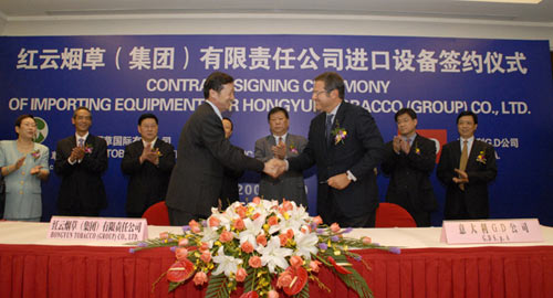 煙草在線紅云消息 2008年9月10日,紅云集團(tuán)與意大利G.D公司進(jìn)口五組超高速卷接包機(jī)組簽約儀式在昆明舉行。在中國煙草國際有限公司、云南中煙工業(yè)公司、云南煙草國際有限公司、意大利GD公司和紅云集團(tuán)領(lǐng)導(dǎo)及相關(guān)人員的共同見證下,紅云集團(tuán)董事長、總裁朱紹明與G.D S.p.A公司市場及銷售董事Cremonini Paolo簽定了進(jìn)口設(shè)備的技術(shù)合同,中國煙草國際有限公司處長余勇俊、副主任陸宏與G.D S.p.A公司市場及銷售董事Cremonini Paolo簽定了進(jìn)口設(shè)備的商務(wù)合同,中國煙草國際有限公司副總經(jīng)理孟法乾與云南煙草國際有限公司總經(jīng)理曹俊輝簽定了委托進(jìn)口代理協(xié)議。這是目前為止中國煙草行業(yè)一次性引進(jìn)技術(shù)水平最高、數(shù)量最多、單筆金額最高的進(jìn)口設(shè)備合同,同時也是意大利G.D公司單筆金額最高的出口設(shè)備合同,標(biāo)志著紅云集團(tuán)昆煙易地技改工程在打造“國內(nèi)一流、趕超國際”現(xiàn)代化強(qiáng)勢企業(yè)的征程上又邁出了新的一步。