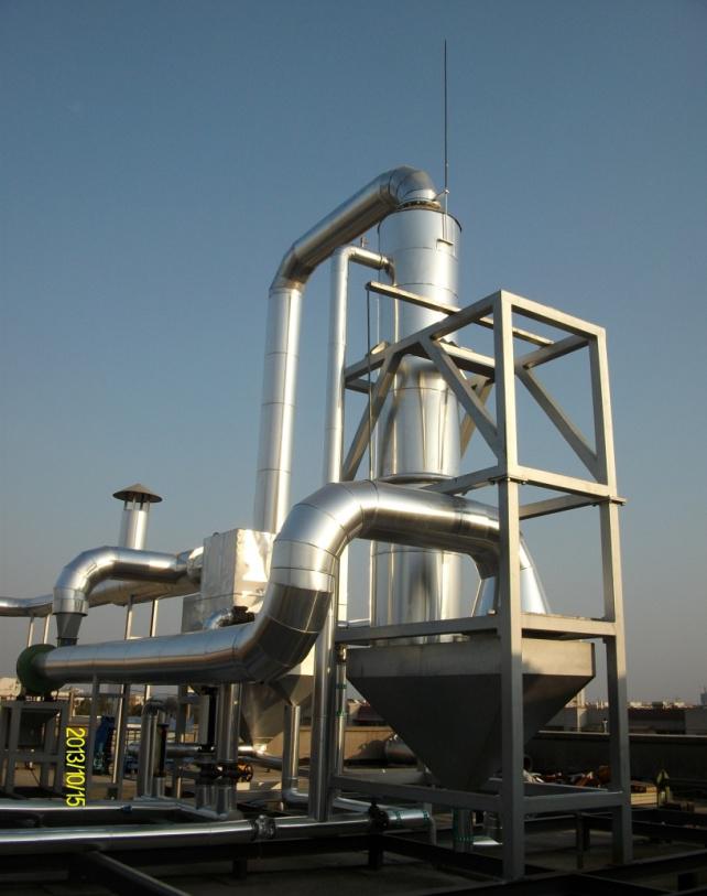 該系統(tǒng)由ZSL系列節(jié)流式氣液交換器、高效換熱器、冷凝水分離器、引風機、循環(huán)水泵、風力平衡裝置、自動控制系統(tǒng)等組成?梢杂糜跓煵葜平z生產(chǎn)線中葉片回潮、薄板烘絲、氣流烘絲、加香加料、煙;爻钡戎T多生產(chǎn)過程排放的高溫高濕氣體處理。