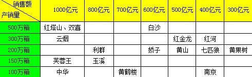 ——湖南中煙:“白沙”確立500萬箱,“芙蓉王”力突1000億元,即:到2012年,“白沙”品牌規(guī)模300萬箱,“芙蓉王”品牌規(guī)模100萬箱,兩大品牌實現(xiàn)稅利500億元,在此基礎上,再過5年或者更長一點時間,“白沙”品牌規(guī)模500萬箱,“芙蓉王”品牌規(guī)模150萬箱,兩大品牌實現(xiàn)稅利1000億元。