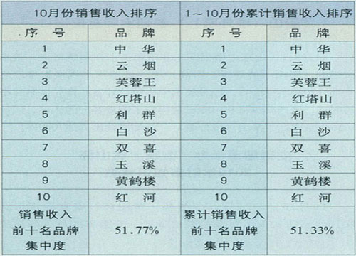 2010年10月份銷售收入前十名品牌集中度情況