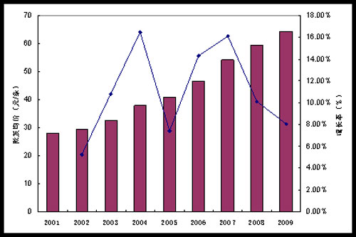 2001年-2009年全國卷煙批發(fā)均價和增長率