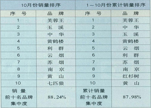 2010年10月份一類煙銷量前十名品牌集中度情況(以百牌號為基礎(chǔ))