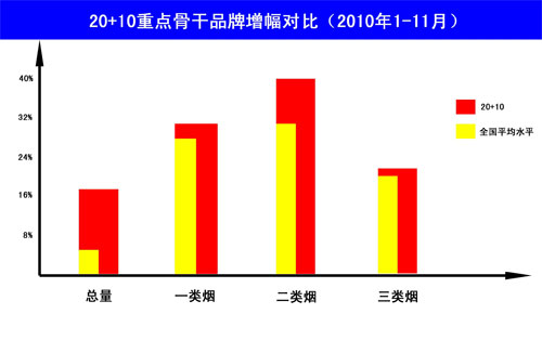 上述政策措施的組合效應(yīng)以重點品牌的快速發(fā)展得以集中呈現(xiàn)。今年1-11月,以20+10重點骨干品牌為代表的優(yōu)勢品牌、強勢品牌保持了較為強勁的增長勢頭,增量、增幅均高于全國平均水平。從數(shù)據(jù)上看,20+10重點骨干品牌的總量增幅高于全國平均水平近15個百分點,市場比重已近六成;20+10重點骨干品牌的一類煙、二類煙、三類煙增幅也分別高出全國平均水平3%、7%、2%左右,并分別占據(jù)了超過90%、80%、80%的市場份額。一方面,“大品牌”表現(xiàn)出了遠超過其它品牌的發(fā)展態(tài)勢和增長水平;另一方面,“大品牌”在市場上的主導作用也進一步凸顯,占據(jù)了舉足輕重的重要地位。