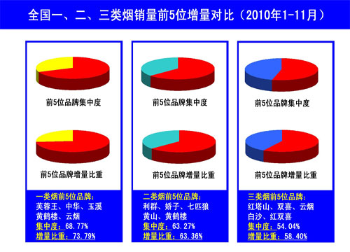 另一方面,按照經(jīng)濟學家巴萊多提出的二八定律,百分之二十的品牌或產(chǎn)品占據(jù)著百分之八十的市場份額,以現(xiàn)時全國120多個的品牌數(shù)量,占據(jù)絕大部分市場份額的將會是不到30個品牌,但實際上,留給那些百分之二十以外品牌的市場空間越來越狹窄,超過百分之八十的品牌正在搶奪不到百分之二十的市場份額。1-11月,一類煙銷量前5位品牌芙蓉王、中華、玉溪、黃鶴樓、云煙的市場集中度已經(jīng)超過68%,增量比重也已占據(jù)七成以上;二類煙銷量前5位品牌利群、嬌子、七匹狼、黃山、黃鶴樓的市場比重、增量比重雙雙超過63%;三類煙銷量前5位品牌紅塔山、雙喜、云煙、白沙、紅雙喜的市場集中度、增量比重雖然相對略低,但同樣雙雙占據(jù)半壁江山。