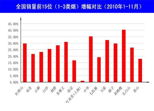 圖三:全國銷量前15位(1-3類煙)品牌增幅對比