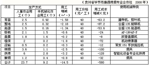 從播種、剪葉、整地、起壟、蓋膜、移栽、綁煙、烘烤等等逐步形成了從播種到烘烤的一條龍式的機(jī)械化生產(chǎn),有效的提高了山區(qū)煙葉種植機(jī)械化作業(yè)水平。隨著機(jī)械化程度的提高,社會化分工也越來越細(xì),以機(jī)械作業(yè)為紐帶,相應(yīng)的成立了育苗專業(yè)隊(duì)、機(jī)耕專業(yè)隊(duì)、植保專業(yè)隊(duì)、烘烤專業(yè)隊(duì)。據(jù)統(tǒng)計(jì),每畝用工育苗比傳統(tǒng)方式減少1.58個,旋耕整地減少2.18個,起壟減少1.34個,移栽減少0.6個,蓋膜減少0.2個,病蟲害防治減少1.8個,運(yùn)輸減少0.3個,綁煙減少2.5個,烘烤減少3.2個,解煙減少0.8個,減少用工成本在580元,大大提高了經(jīng)濟(jì)效益,也就相當(dāng)于煙農(nóng)增收了580元。由于組建了烤煙專業(yè)合作社,烤煙生產(chǎn)互助合作化程度高,煙農(nóng)的既得利得到真正體現(xiàn),煙農(nóng)種煙積極性普遍高漲,煙農(nóng)自愿接受合作組織的領(lǐng)導(dǎo),專業(yè)化分工越來越細(xì),社會化服務(wù)逐步完善,一些煙區(qū)還涌現(xiàn)出了大批的職業(yè)煙農(nóng)。